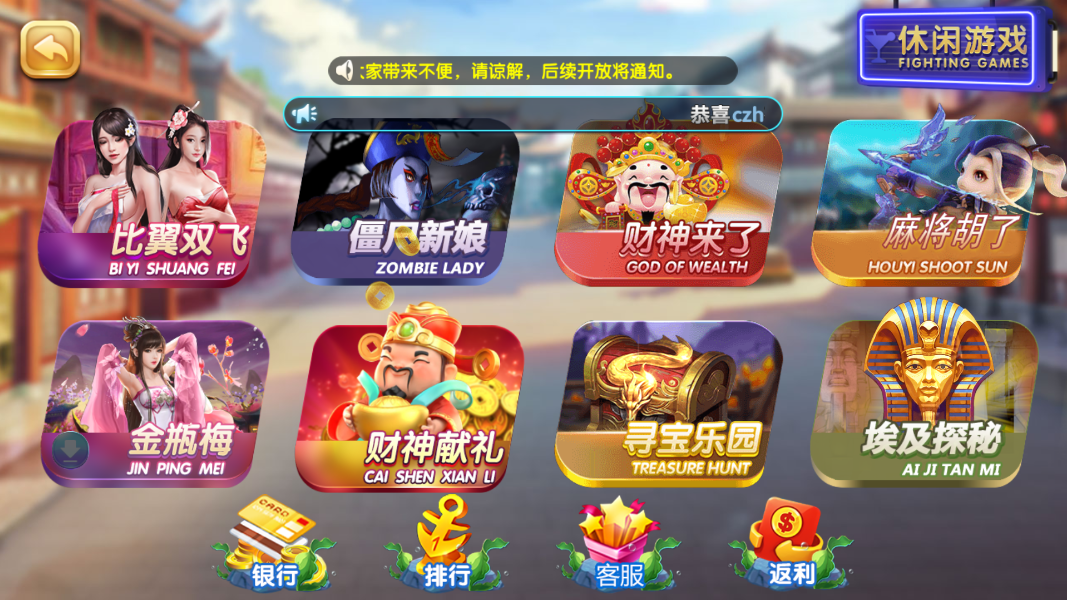 包含子游戏:拉霸类、比翼双飞、金瓶梅、财神献礼、绝地求生、秘鲁传说、财神来了、熊猫啃竹、僵尸新娘、麻将胡了